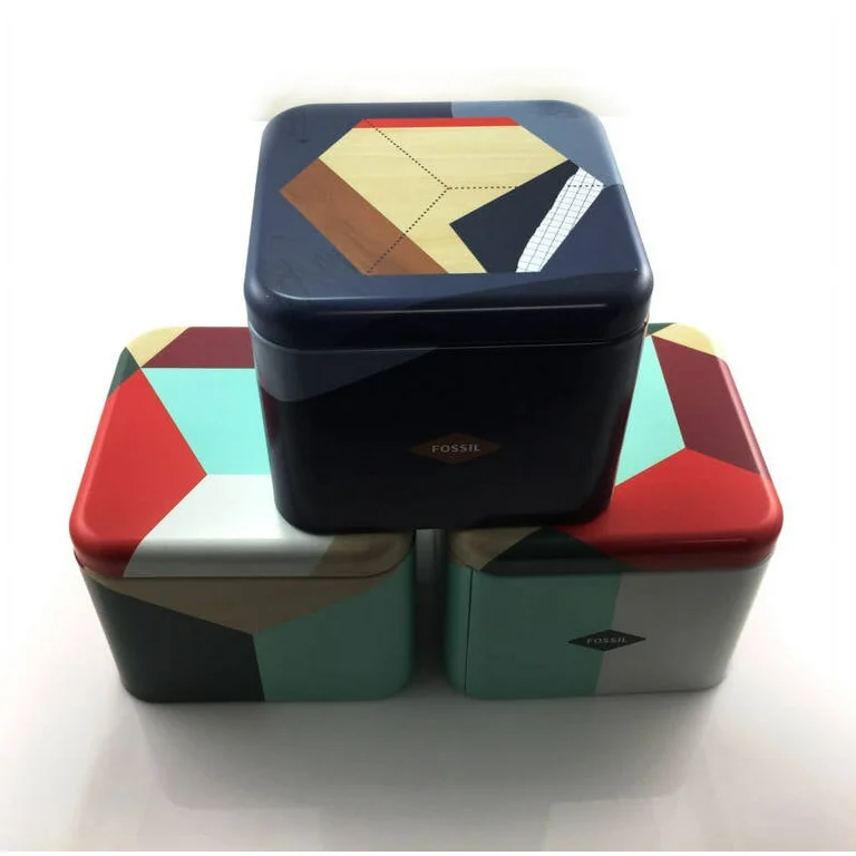 The Fossil watches tin packaging comes in a designer metal box featuring a colorful geometric lid—perfectly reflecting Fossil’s signature vintage-modern aesthetic.