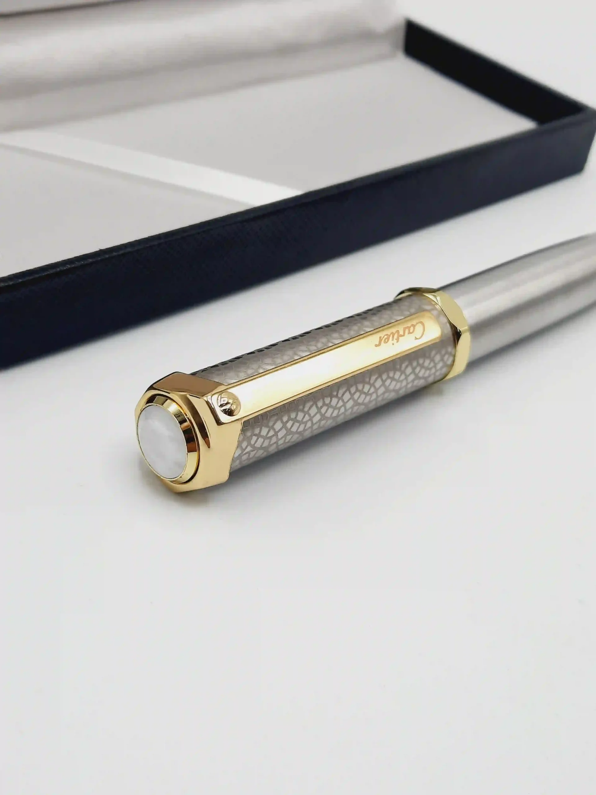 Featuring a sleek silver composite body with gold-finish details, this pen embodies sophistication and charm for those who care. The Cartier mark as a detail with white resin stone of the top is mark of stellar design and marksmanship.